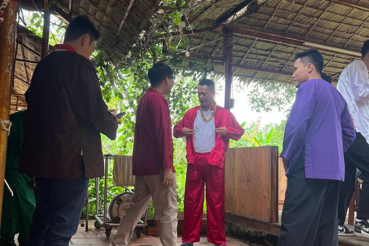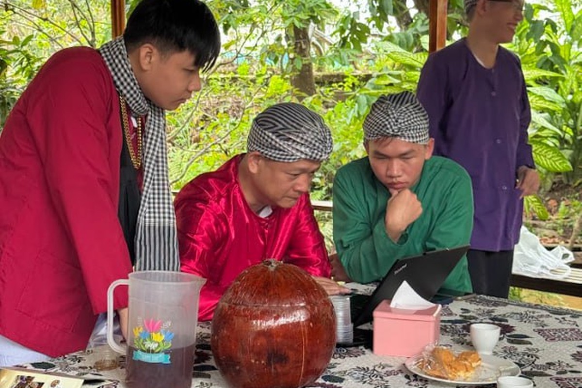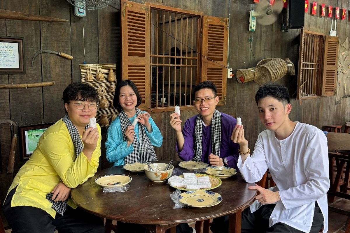 Vừa đặt chân lên Cồn Sơn, Đoàn được người dân địa phương đón tiếp bằng những ly nước mát và bánh quê mộc mạc. Các thành viên háo hức thay áo bà ba để hòa mình vào không khí miền Tây – tạo nên những bức ảnh hài hước và màu sắc của từng cá nhân.