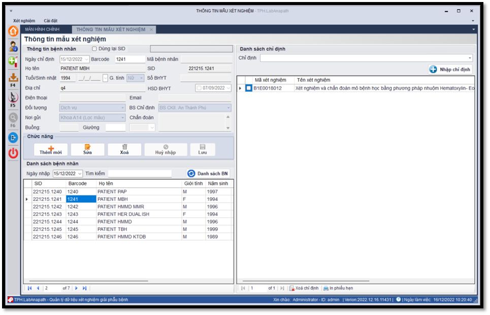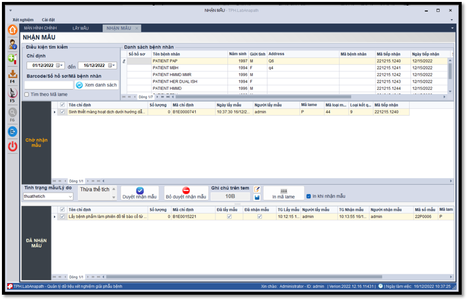 Ngay tại khâu tiếp nhận chỉ định của Người bệnh, TPH.LabAnapath cho phép Người dùng tiếp nhận từ Hệ thống HIS hoặc nhập thủ công thông tin hành chính, chỉ định lâm sàng và loại xét nghiệm cần thực hiện. Hệ thống hỗ trợ in mã vạch để dán ống mẫu hoặc bệnh phẩm, giúp giảm nhầm lẫn trong quá trình xử lý.