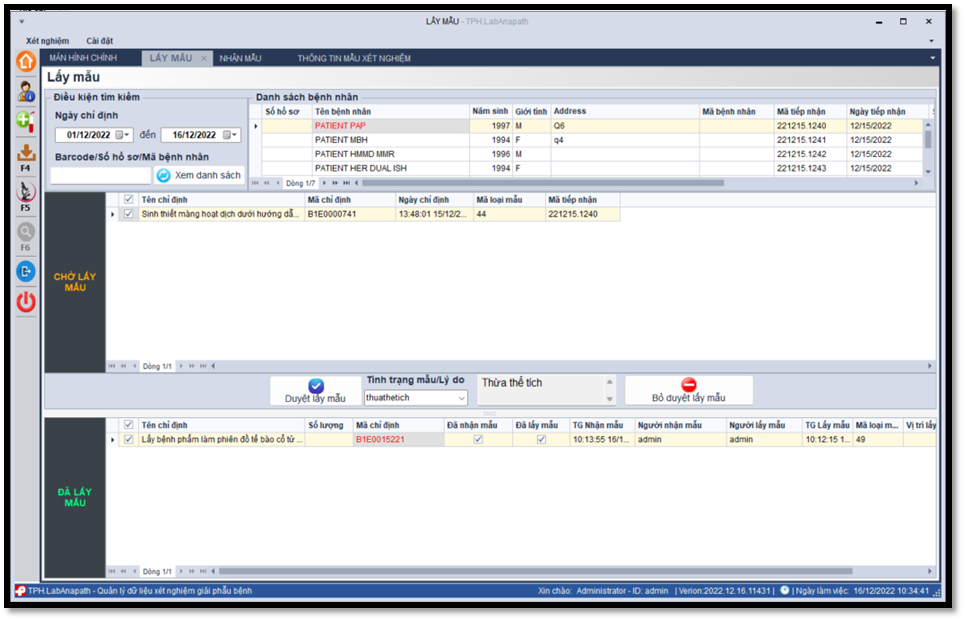 Sau khi tiếp nhận, mẫu bệnh phẩm được đưa vào danh sách chờ lấy mẫu. Nhân viên thực hiện lấy mẫu có thể ghi nhận thời gian, tình trạng mẫu và cập nhật trạng thái trực tiếp trên phần mềm. Trường hợp mẫu không đạt yêu cầu, Hệ thống hỗ trợ ghi nhận và xử lý theo đúng quy trình của Cơ sở Y tế.